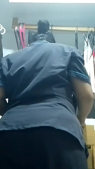 "MILF maid masturbates her big ass in her boss's locker room while he works"